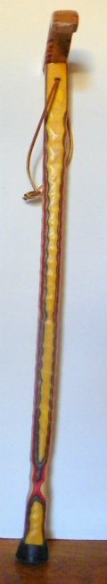 This cane is made from multi color Birch and Laminated together square stock with rounded edges and swirl pattern. It has a Natural finish on it. It is 36 inches long and 1 thick and has exceptional Strength. It is made up of Yellow Blue Red and Natural Birch. Features: * Non-Skid Rubber Tip! * Water Resistant Finish! * Cut to Length! * Complimentary Wrist Strip.