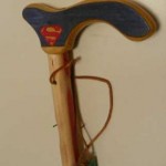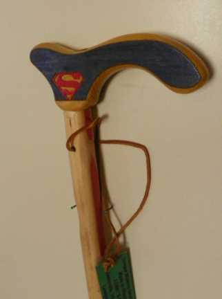 This Cane is made from Maple with blue and red Birch Laminated to it. The handle is made from Osage Orange with red and blue Birch also laminated to it with a red Superman logo inlayed into the Blue side of the handle. It is 36 inches long. It has a Natural finish on it. Features: * Non-Skid Rubber Tip! * Water Resistant Finish! * Cut to Length! * Complimentary Wrist Strip.