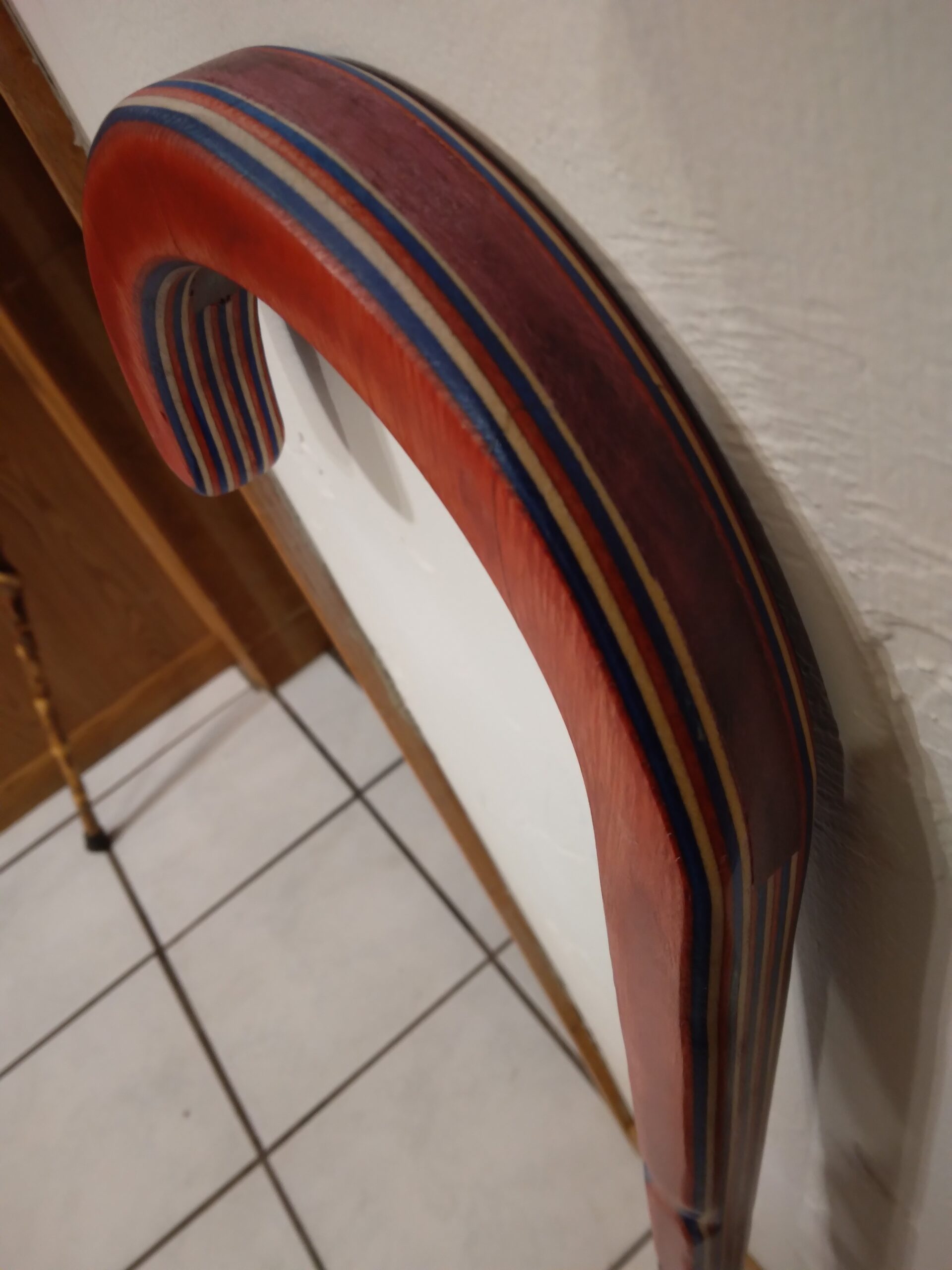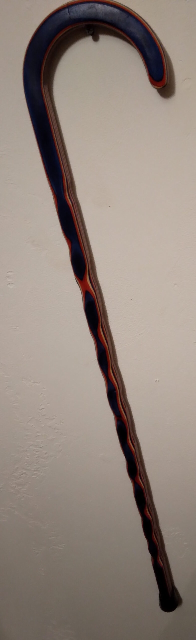 This Martial Arts Defense Cane is made of laminated dyed birch veneer, showing red, white, and blue colors in its layers. Cane length is 38″.