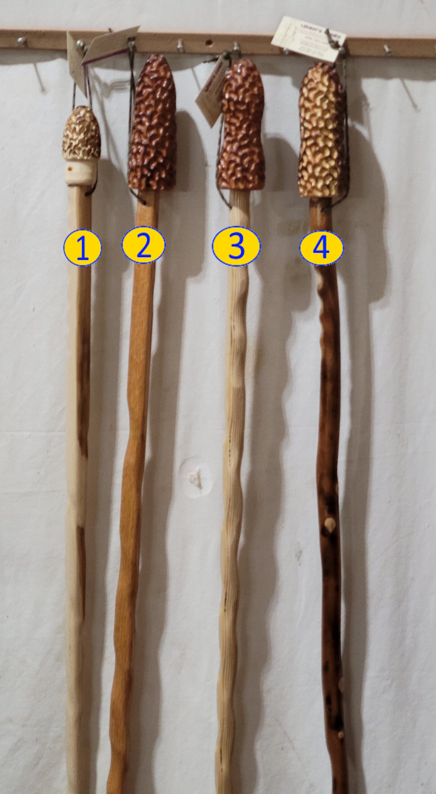 Here are more choices of the popular Morel style. These hand-crafted hardwood sticks feature a wooden “morel” topper. See the photos to choose your one-of-a-kind walking stick. Note the $15 discount for #1.